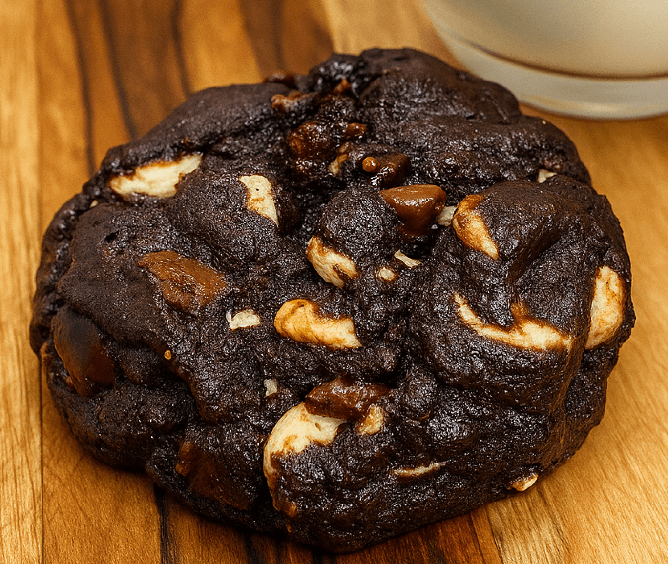 Cookie de 75g com massa de cacau e gotas de chocolate meio amargo e de chocolate branco
